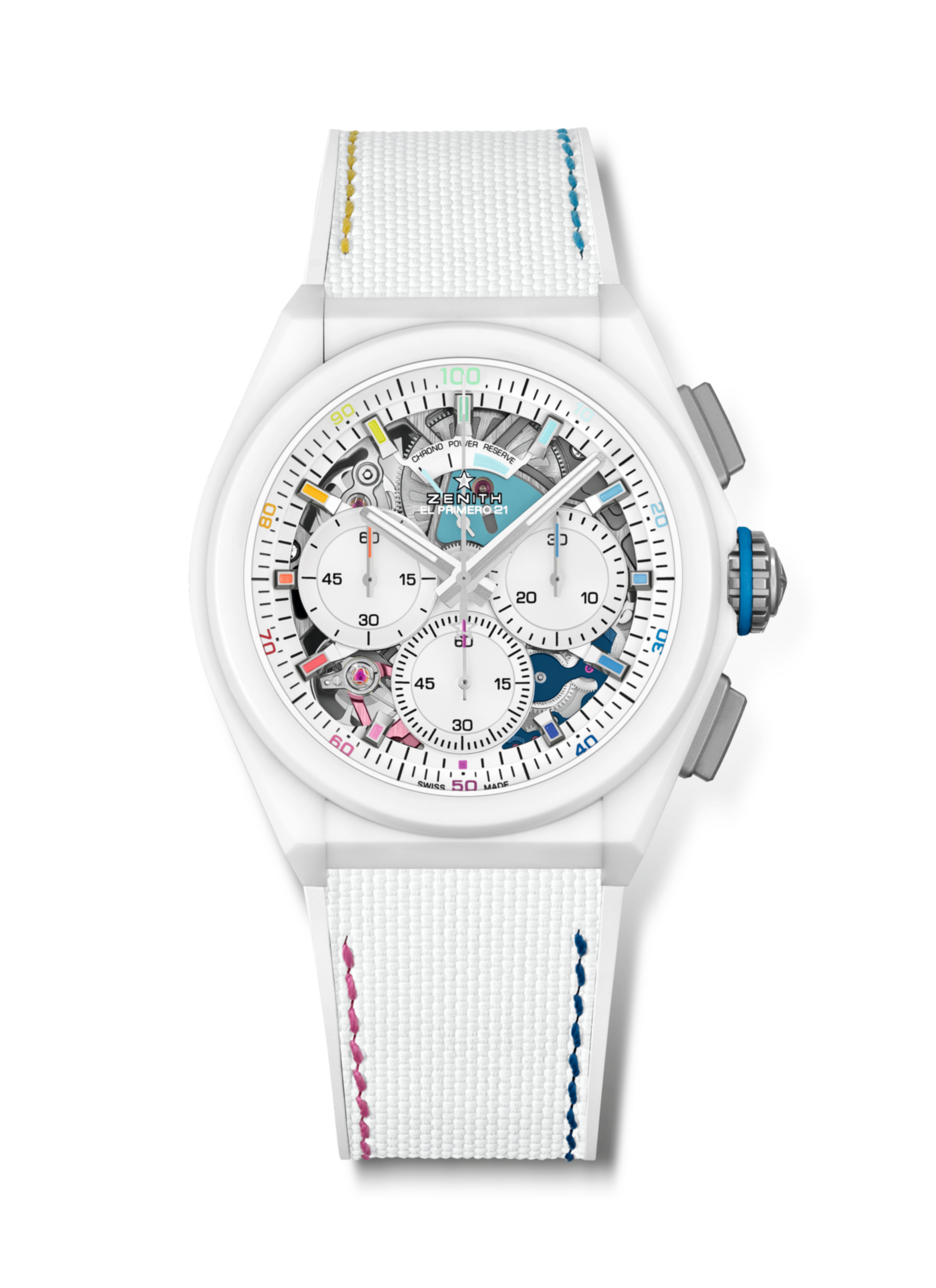 El DEFY 21 Chroma II es una colorida ejecución de El Primero 21, el cronógrafo de alta frecuencia con indicación de las centésimas de segundo, que se presenta en una caja de cerámica blanca mate de 44 mm y cuyo movimiento con los colores del arcoíris se puede ver a través de la esfera abierta engastada, por su parte, con unos índices que revelan una gradación de tonos. Asimismo, la correa de caucho blanco incluye unos pespuntes con los colores del arcoíris.