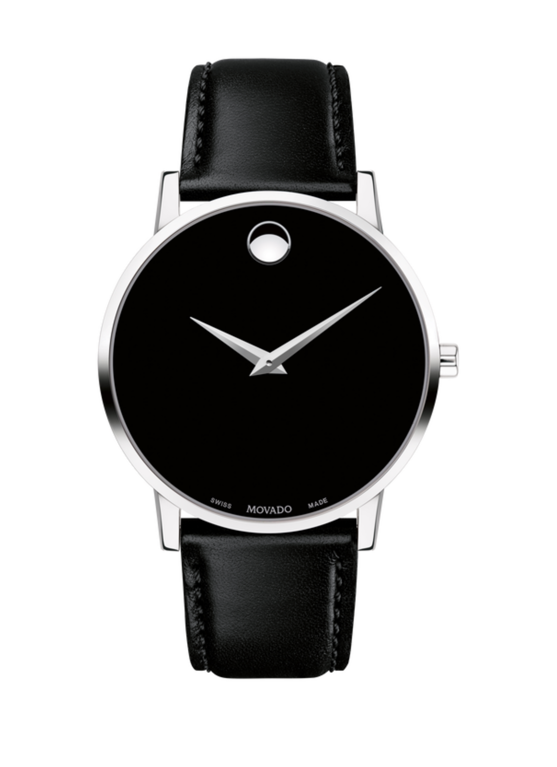 Reloj Museum Classic para hombre, caja de acero inoxidable de 40 mm, esfera Museum negra con punto y agujas en tono plateado, correa de piel de becerro negra con hebilla de acero inoxidable.