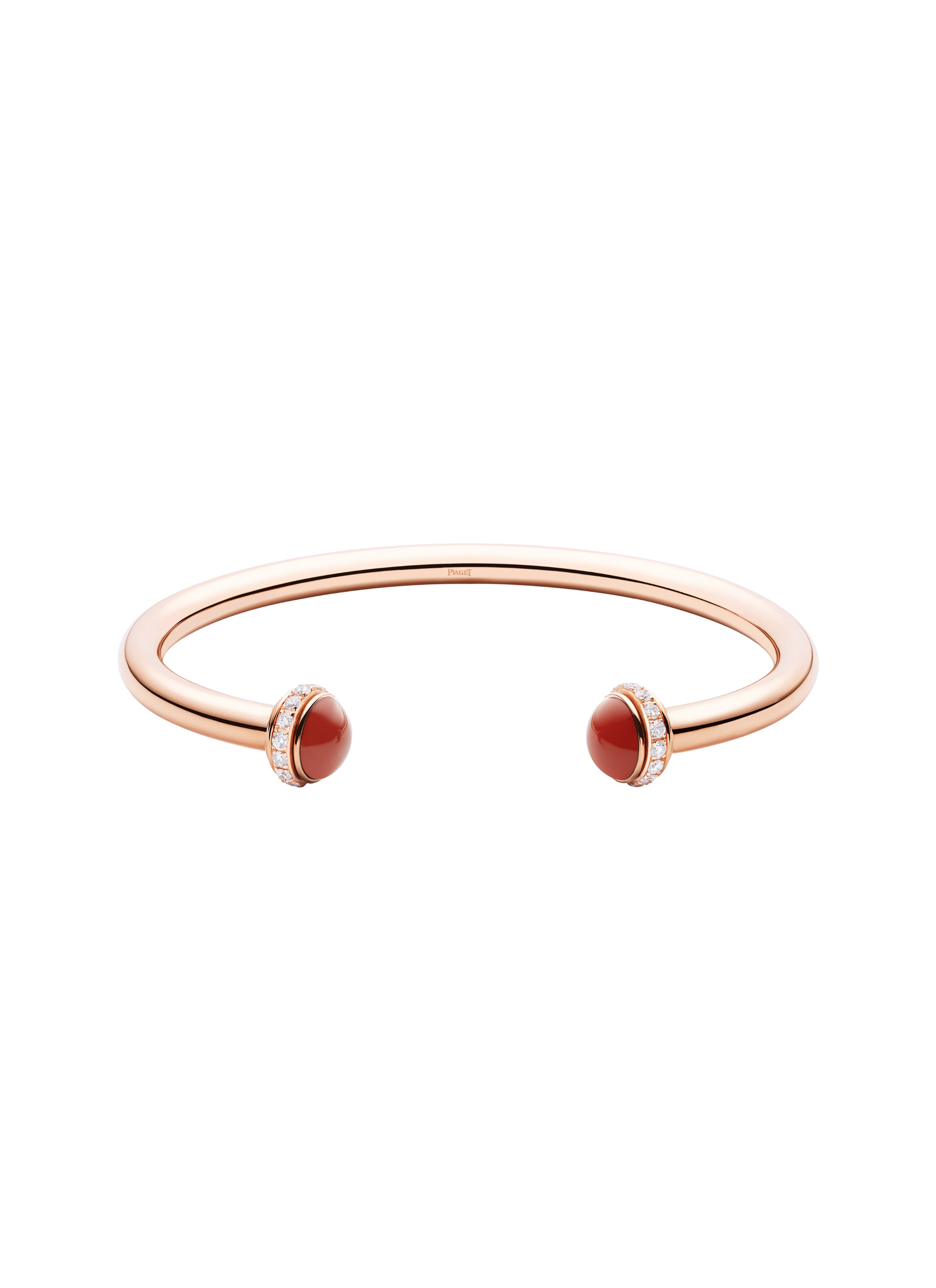 Pulsera abierta de oro rosa decorada con dos cabujones de cornalina roja y anillos giratorios con pavé de diamantes. Con sus brillantes piedras ornamentales, la pulsera abierta Possession de oro rosa de Piaget es una compañera alegre y colorida. Elegante al extremo, esta pulsera de oro rosa está adornada con una cornalina roja redonda en cada extremo.