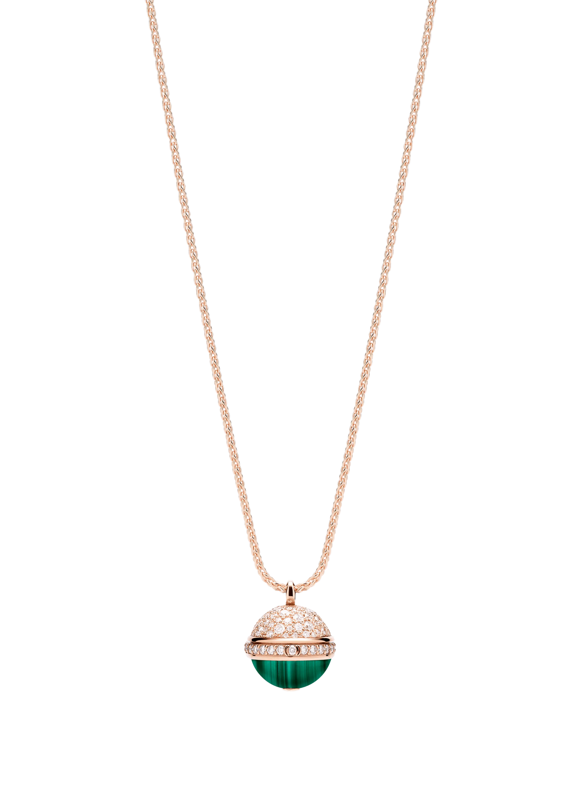 Collar largo Possession en oro rosa con colgante de malaquita y diamantes. Cautivador y empoderador, el colorido colgante Possession en un collar largo de oro rosa es un elegante complemento para la mujer contemporánea.