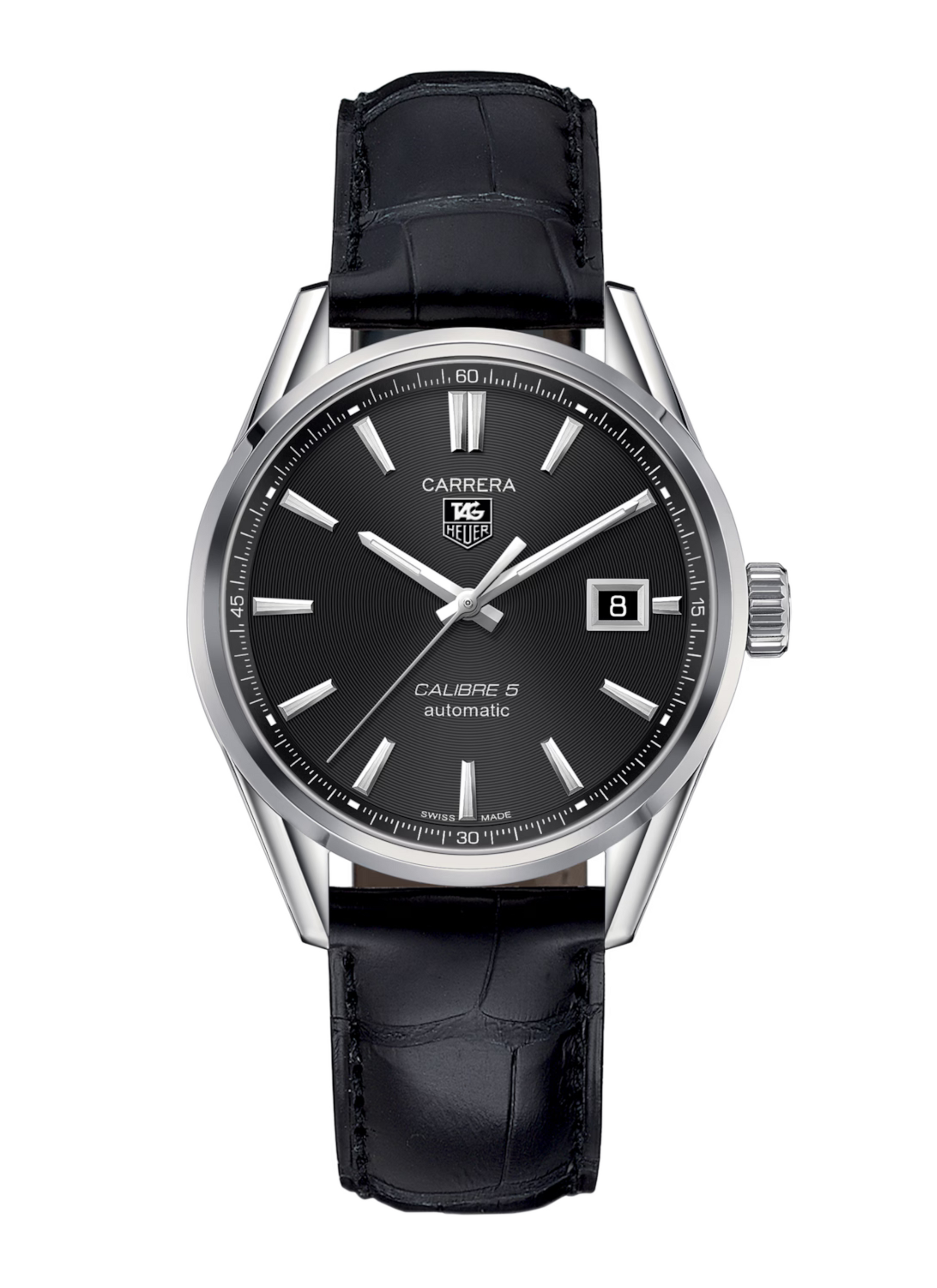 Un reloj negro con tres agujas con caja de acero de 39 mm y correa de piel de cocodrilo negra. El despejado diseño de la esfera es una característica del clásico TAG Heuer Carrera: un diseño elegante y fácil de leer de un vistazo.
