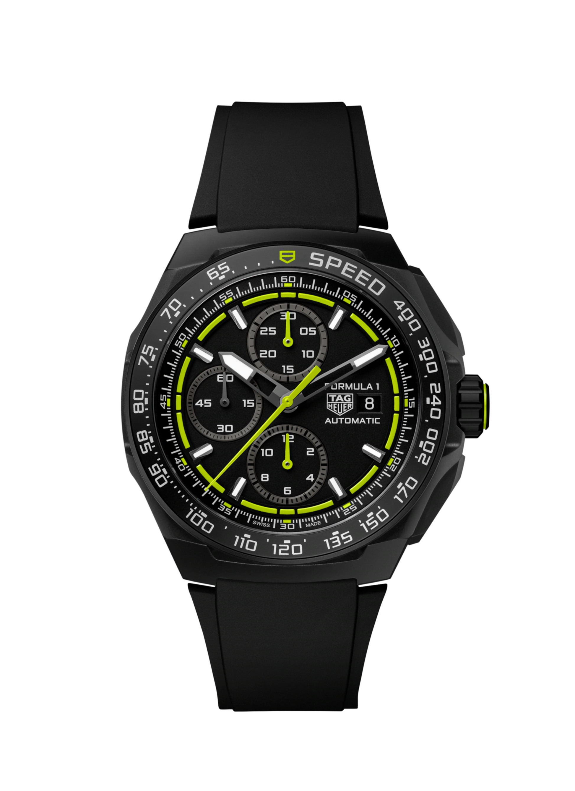 El TAG Heuer Formula 1 Chronograph presenta una nueva y atrevida combinación de colores en su caja de 44 mm. Con detalles lima y un diseño dinámico, este reloj está pensado para el piloto moderno que valora la precisión y el estilo.