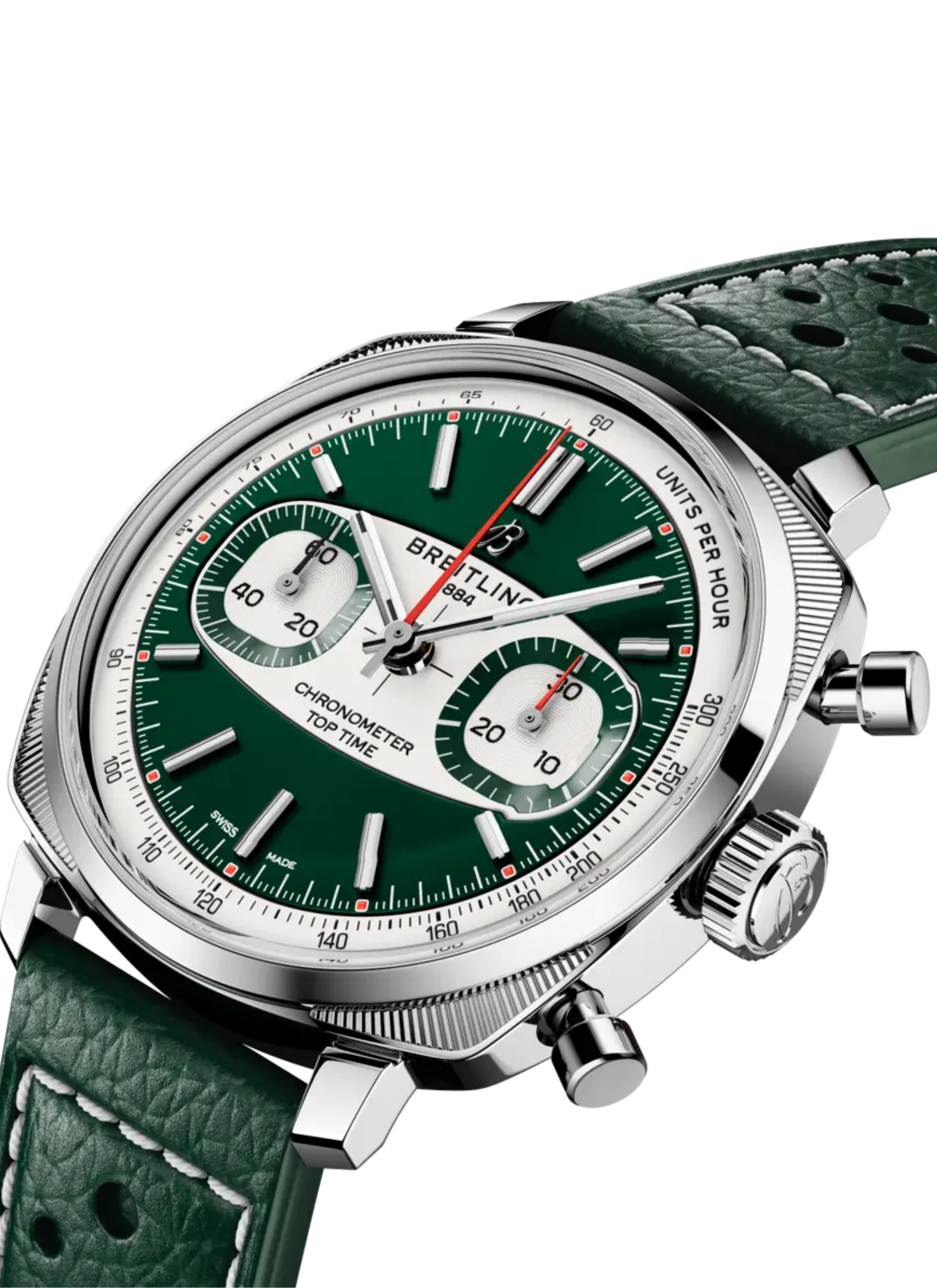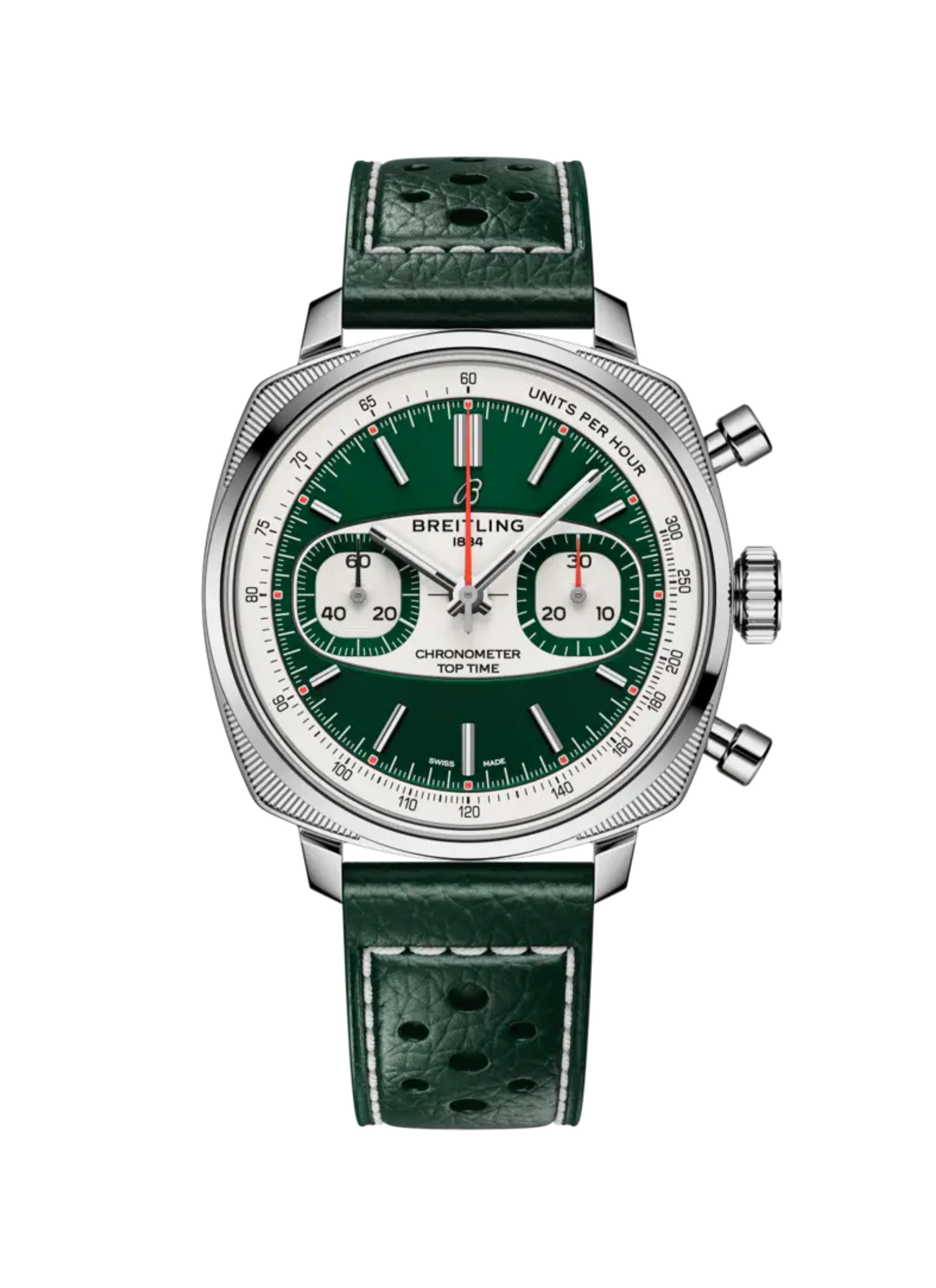 La gama poco convencional de cronógrafos de Willy Breitling, que se presentó en los transformadores años 60, está inspirada en las carreras y transmite el espíritu libre de aquella época. Hoy, la nueva colección Top Time canaliza esa energía llena de adrenalina combinando un diseño retro moderno con un rendimiento de vanguardia. El Top Time Racing deriva de algunos de los diseños más llamativos de Top Time de los años 60. La caja con forma de cojín, la atrevida escala taquimétrica y las distintivas subesferas en forma de círculo-cuadrado evocan las altas velocidades y las decisiones relámpago de un circuito de carreras.