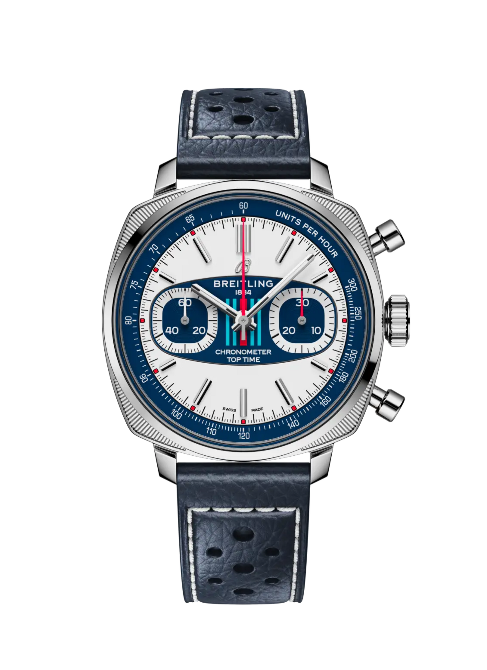 La gama poco convencional de cronógrafos de Willy Breitling, que se presentó en los transformadores años 60, está inspirada en las carreras y transmite el espíritu libre de aquella época. Hoy, la nueva colección Top Time canaliza esa energía llena de adrenalina combinando un diseño retro moderno con un rendimiento de vanguardia. El Top Time Racing deriva de algunos de los diseños más llamativos de Top Time de los años 60. La caja con forma de cojín, la atrevida escala taquimétrica y las distintivas subesferas en forma de círculo-cuadrado evocan las altas velocidades y las decisiones relámpago de un circuito de carreras.